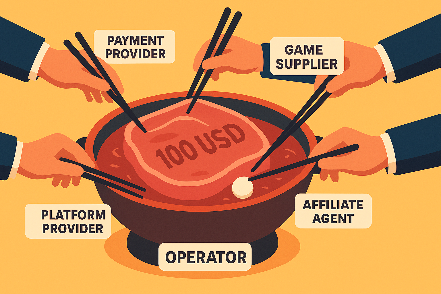 底料(站長)看起來最厚,結果一撈發現其實被湯底(供應商)、蔬菜(金流)、豆皮(代理)分掉一堆,最後站長只剩下一片火鍋店送的免費白蘿蔔。